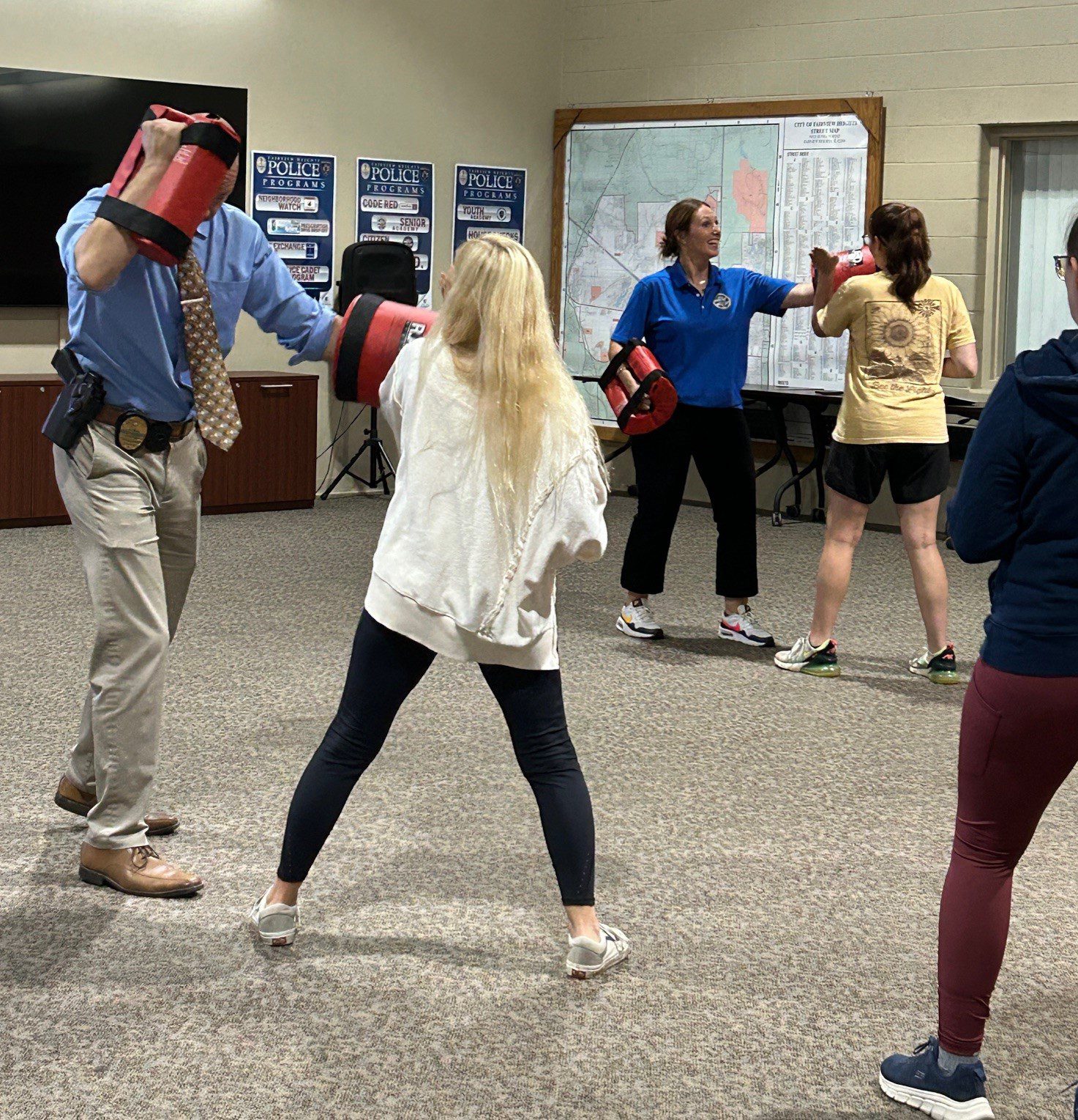 R.A.D., short for Rape Aggression Defense System is a free class offered to all women over the age of 14. The four-week training focuses on education and awareness and empowers women to say NO, defend themselves, and prepare for “real world” encounters. This internationally recognized program has a lifetime return and practice policy. Four instructors Detective Sergeant Aaron Nyman, Detective Hannah Millington, Sergeant Tony Flinn, and Executive Assistant Amber Hopkins have taught over 200 women how to defend themselves in the short time this program has been offered. Classes are held several times a year.